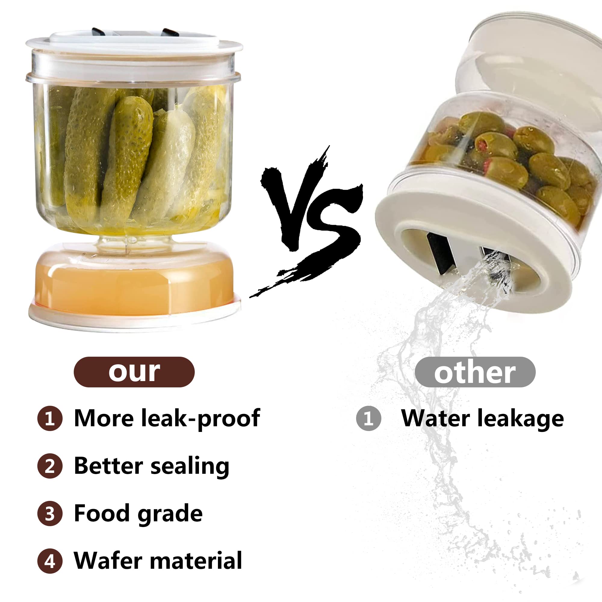 The pickle jar design to separate liquid from the pickles when you flip it, After you finish eating, flipping back the jar and the pickles soaking in brine again to maintain their freshness and savor.
